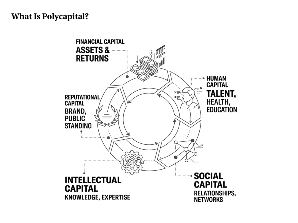 The Polycapital Framework: Modern family offices manage not only financial assets, but human, social, intellectual, and reputational capital as interconnected drivers of long-term legacy.